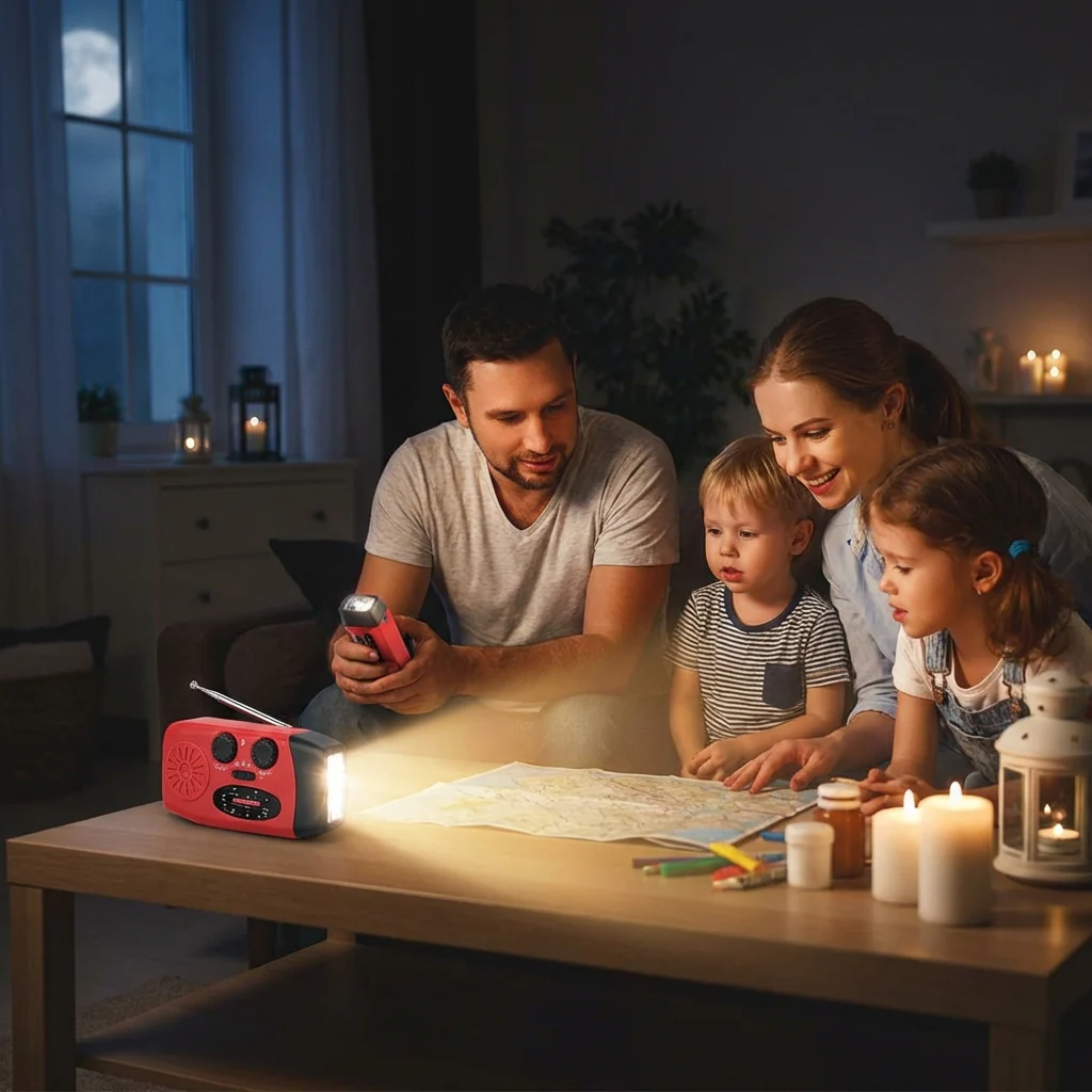 Y cuando cae la noche o no hay ninguna fuente de electricidad disponible, la manivela integrada te permite generar energía en cualquier momento.